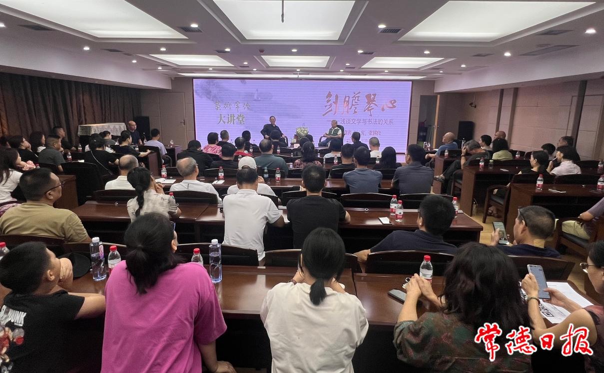 8月24日上午,常德市文化館在四樓新聞發(fā)布廳舉辦藝術(shù)常德大講堂,近300名文學(xué)、書法愛好者濟(jì)濟(jì)一堂,共同聆聽湖南省作家協(xié)會名譽主席水運憲、著名書法家張錫良暢談文學(xué)與書法的關(guān)系。