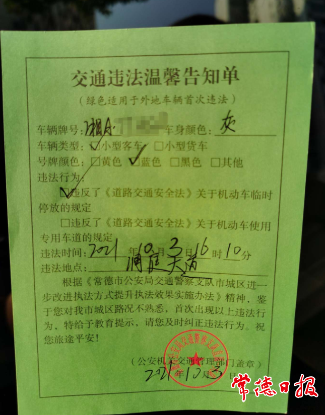 外地車輛收“綠色罰單” 溫馨告知不處罰
