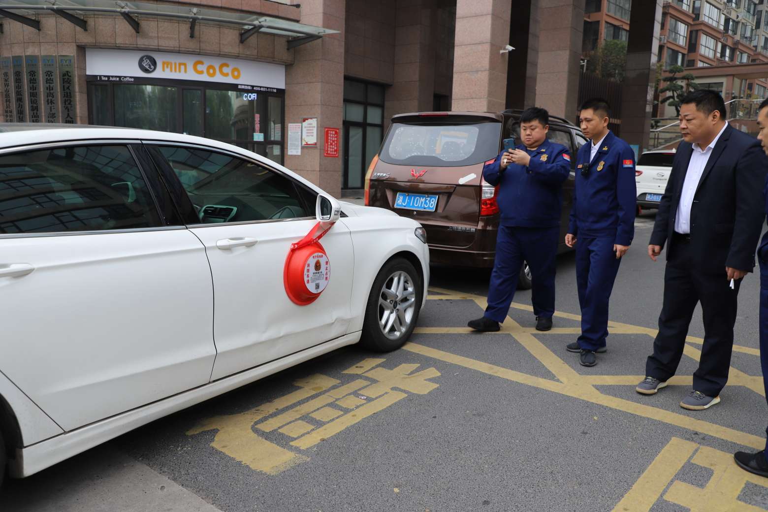 消防執(zhí)法監(jiān)督員在占用消防通道的車上扣上“紅臉盆”