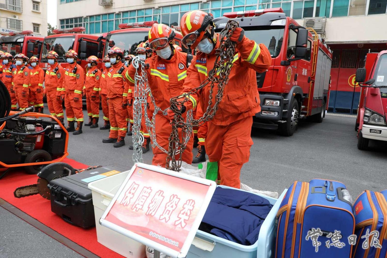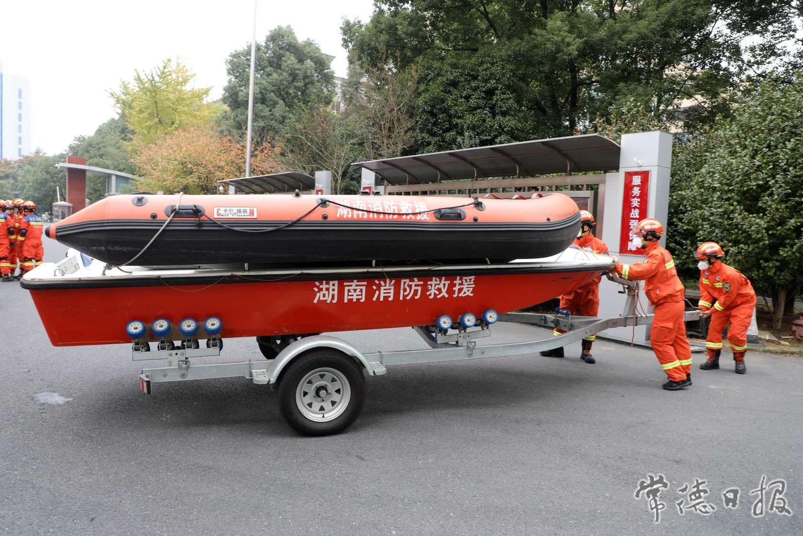 消防員在集結沖鋒舟、橡皮艇
