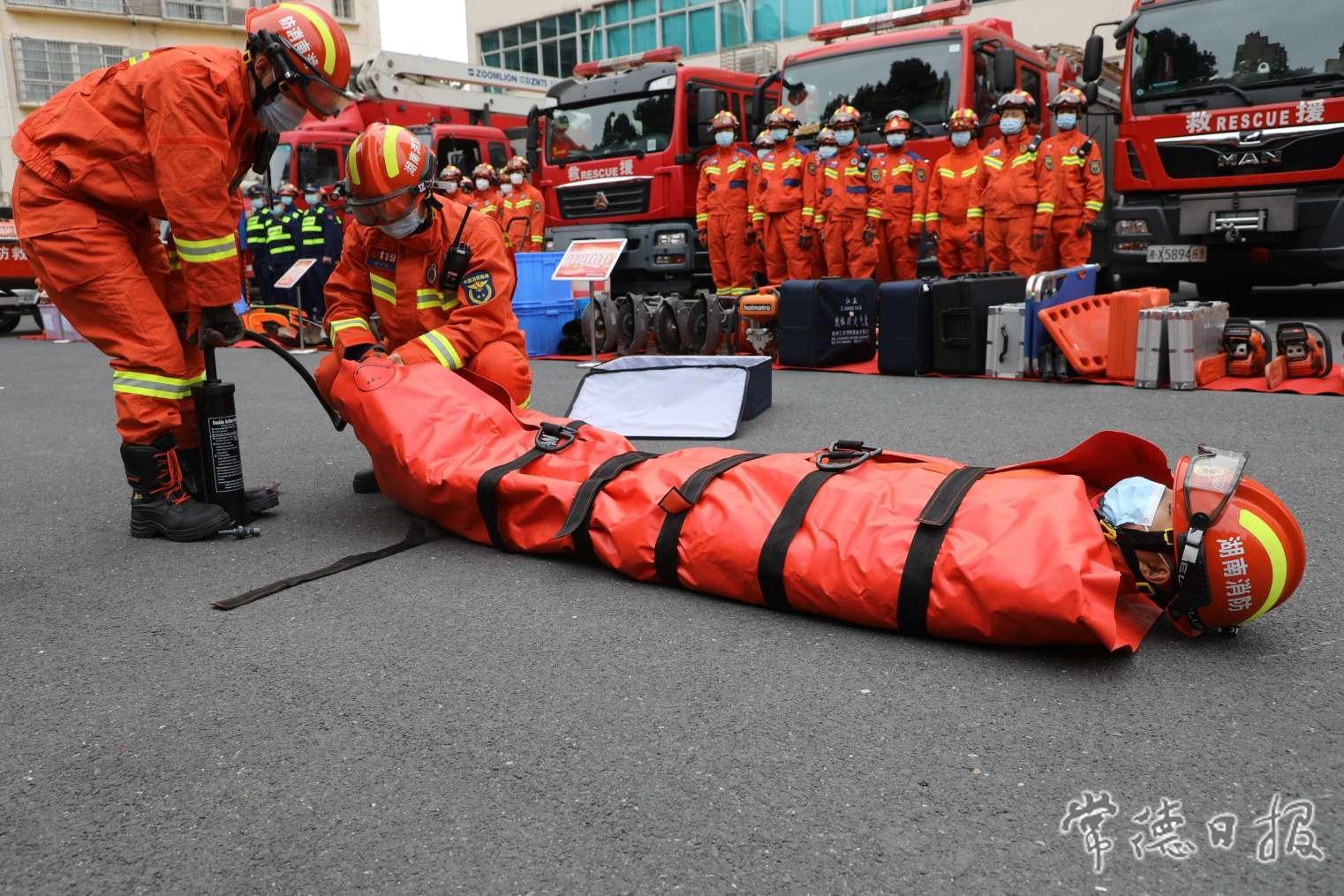 消防員模擬“軀體固定氣囊”救援演練