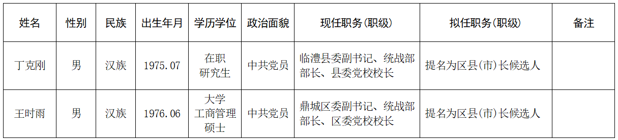為了加強(qiáng)對(duì)干部選拔工作的監(jiān)督,提高識(shí)別和任用干部的準(zhǔn)確程度,現(xiàn)對(duì)市委常委會(huì)會(huì)議研究決定的下列擬任人選(候選人人選、提名人選)進(jìn)行任前公示: