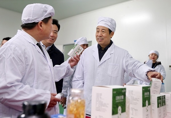 2月13日,副省長吳桂英來到湘潭,就醫(yī)藥產(chǎn)業(yè)和大健康產(chǎn)業(yè)發(fā)展情況進行調(diào)研。圖為吳桂英在湖南一格制藥有限公司調(diào)研。