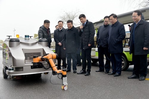 2月13日,副省長陳飛率隊前往長沙高新區(qū)就工程機械產(chǎn)業(yè)鏈發(fā)展情況進行調(diào)研。圖為陳飛在中聯(lián)重科觀看環(huán)衛(wèi)智慧清撿保潔機器人設(shè)備演示。