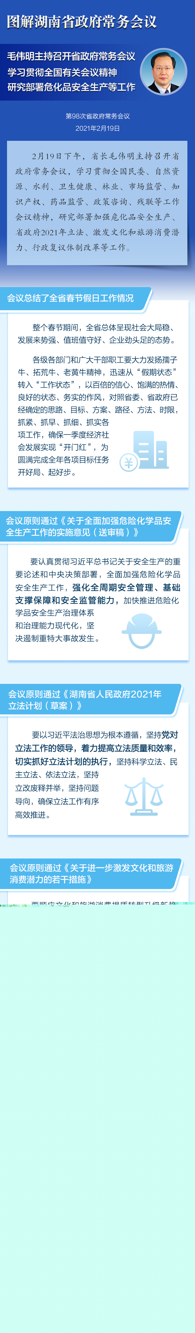 2月19日下午,省長毛偉明主持召開省政府常務會議,學習貫徹全國民委、自然資源、水利、衛(wèi)生健康、林業(yè)、市場監(jiān)管、知識產(chǎn)權、藥品監(jiān)管、政策咨詢、殘聯(lián)等工作會議精神,研究部署加強?;钒踩a(chǎn)、省政府2021年立法、激發(fā)文化和旅游消費潛力、行政復議體制改革等工作。