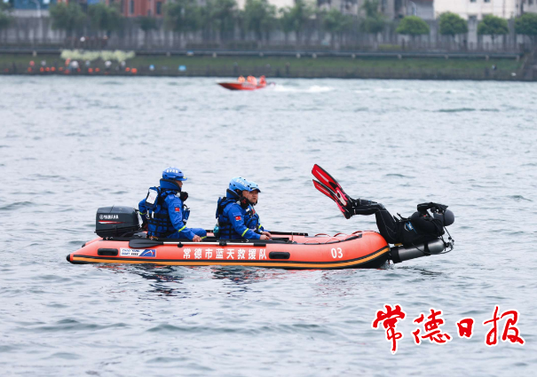 救援落水群眾課目演練過(guò)程中,常德市藍(lán)天救援隊(duì)的潛水員入水