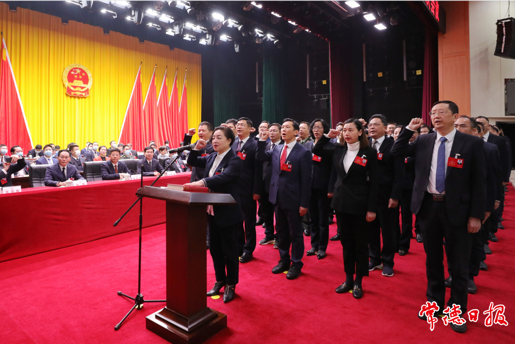 新當(dāng)選的常德市第八屆市人大常委會(huì)秘書長、市人大常委會(huì)委員、市人大各專門委員會(huì)組成人員集體向憲法宣誓。記者 裴維維 攝