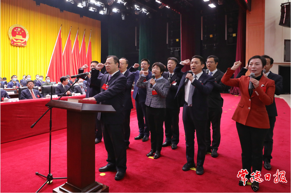 新當(dāng)選的常德市人民政府市長、副市長,市監(jiān)察委員會(huì)主任,市中級人民法院院長集體向憲法宣誓。記者 裴維維 攝