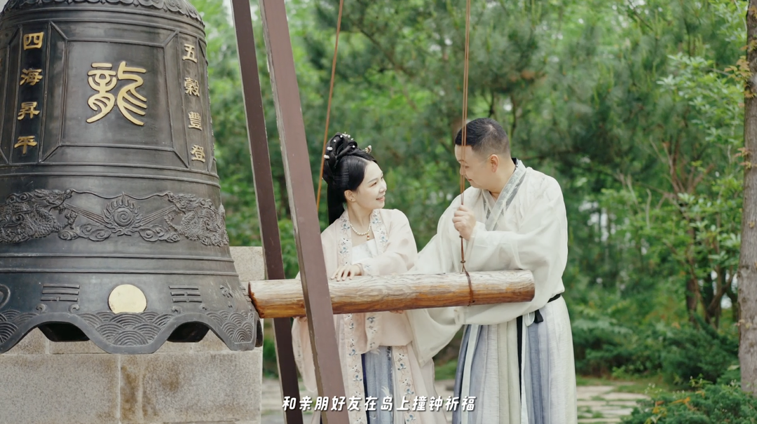 乘船來到湖心島,傾聽吟唱千年的漁歌,體會柳毅傳書的浪漫,和親朋好友在島上撞鐘祈福。在湖光山色之中,良人陪伴,花好月圓。