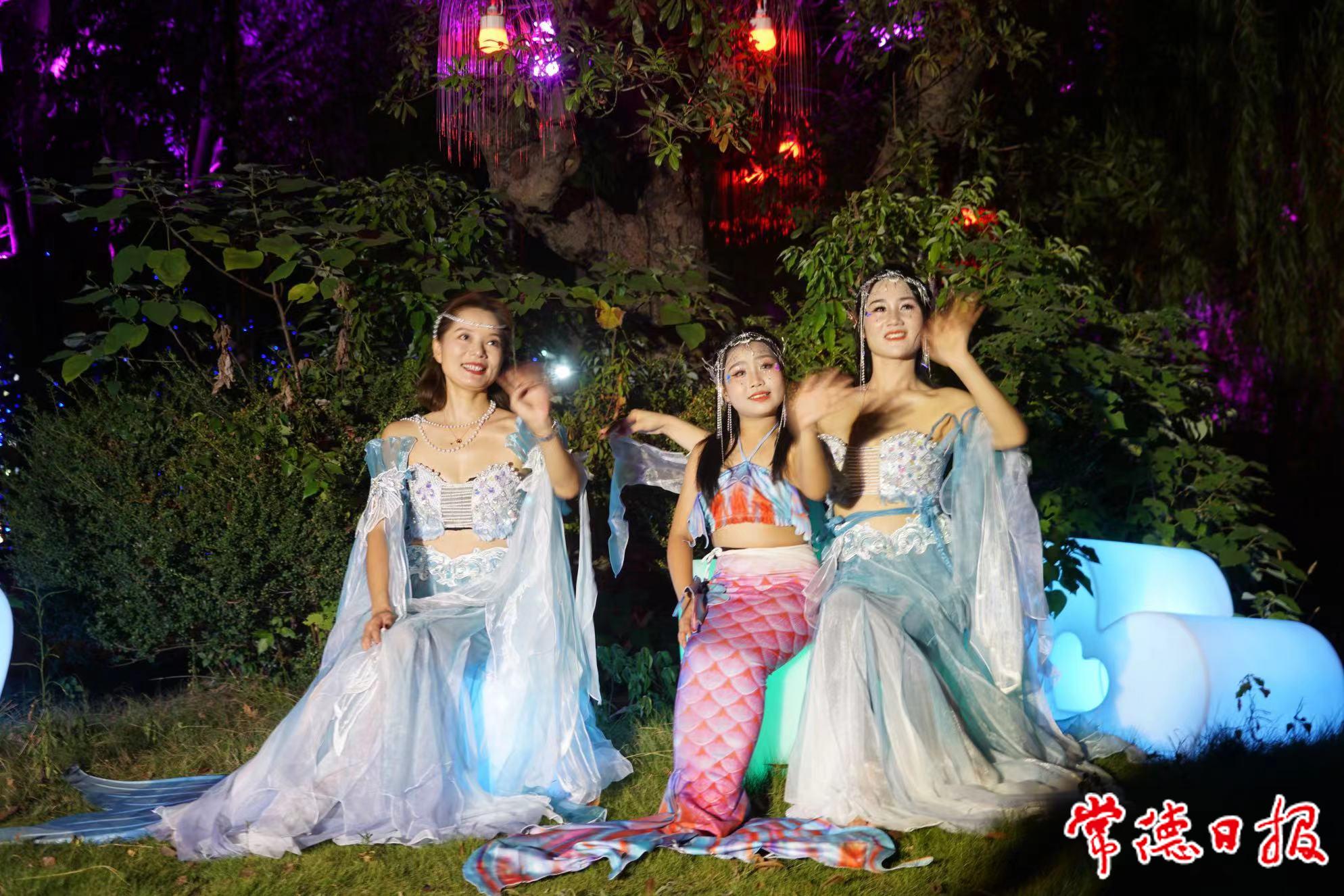 19時(shí)30分來(lái)到狐仙島,不遠(yuǎn)處傳來(lái)陣陣動(dòng)聽(tīng)的音樂(lè),一片燈光掩映之下,一位舞蹈演員身著白紗翩翩起舞。在燈光的照射下,白紗輕輕飄動(dòng),演員的舞姿輕盈、靈動(dòng),讓觀眾們享受一場(chǎng)視聽(tīng)的盛宴??赐晖敢暪诺湮?,一旁的“人魚(yú)公主”正等待著我們。三位妝造精致的演員全情投入,扮演著童話故事里的美人魚(yú)公主,向經(jīng)過(guò)的游客打招呼。現(xiàn)場(chǎng)有不少小朋友上前合影。20時(shí),漁歌島上點(diǎn)起篝火,游客們和演員手拉手圍著篝火一起跳舞、一起唱歌,將整晚的演出推向高潮。