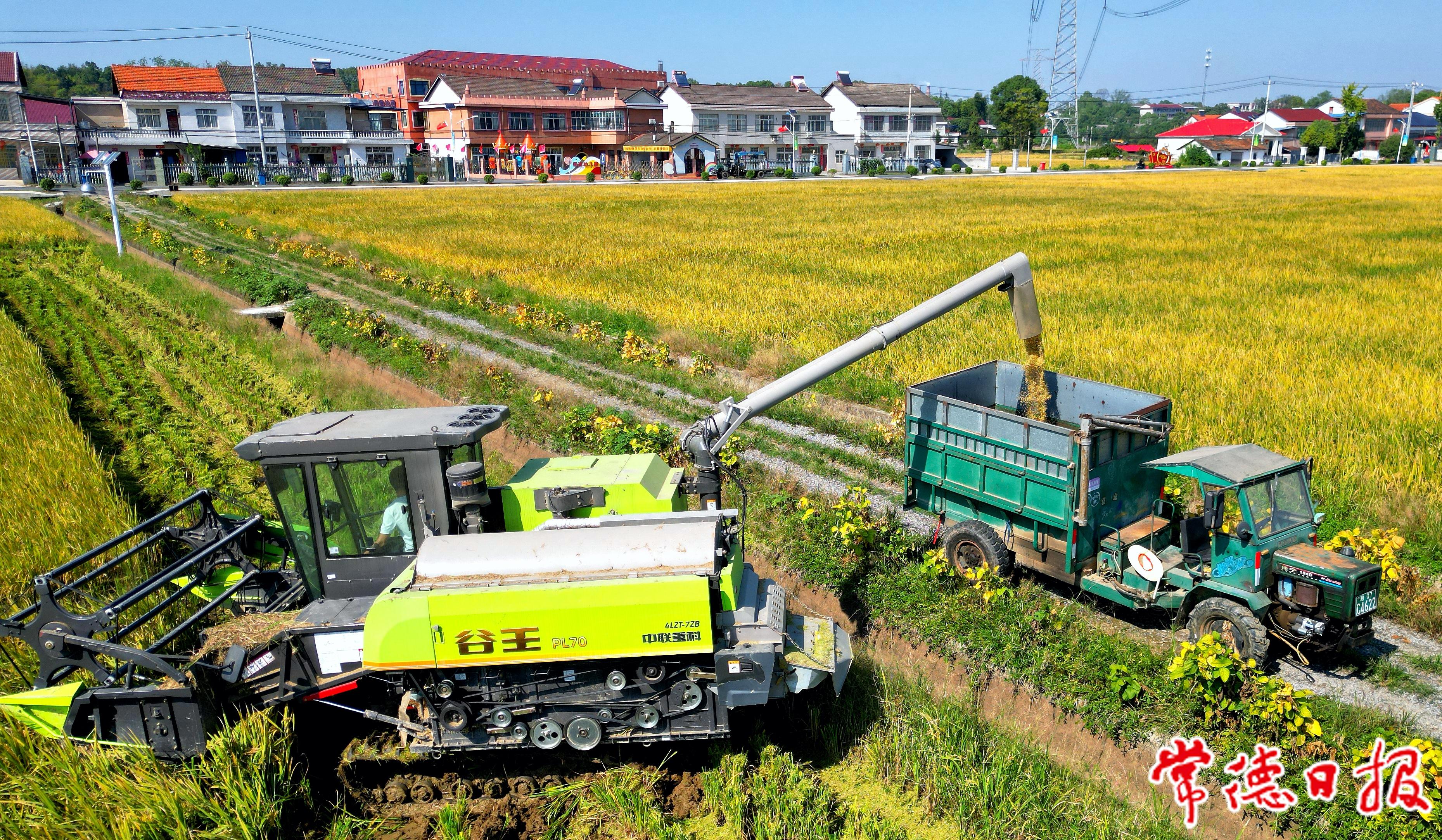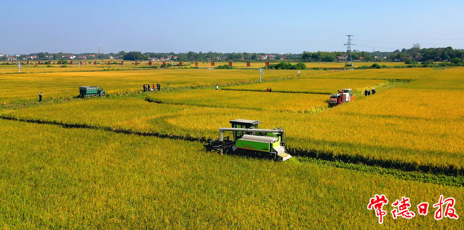 金秋十月,鼎城區(qū)的晚稻陸續(xù)成熟,一片金黃的豐收盛景。10月24日下午1時(shí)許,在謝家鋪鎮(zhèn)糧食生產(chǎn)萬畝綜合示范片,一望無際的稻浪中,傳來陣陣轟鳴農(nóng)機(jī)聲。放眼望去,種糧大戶戴宏和他的父親分別駕駛著大型收割機(jī)開足馬力來回穿梭,割穗、脫粒、稻谷裝車等工序一氣呵成。