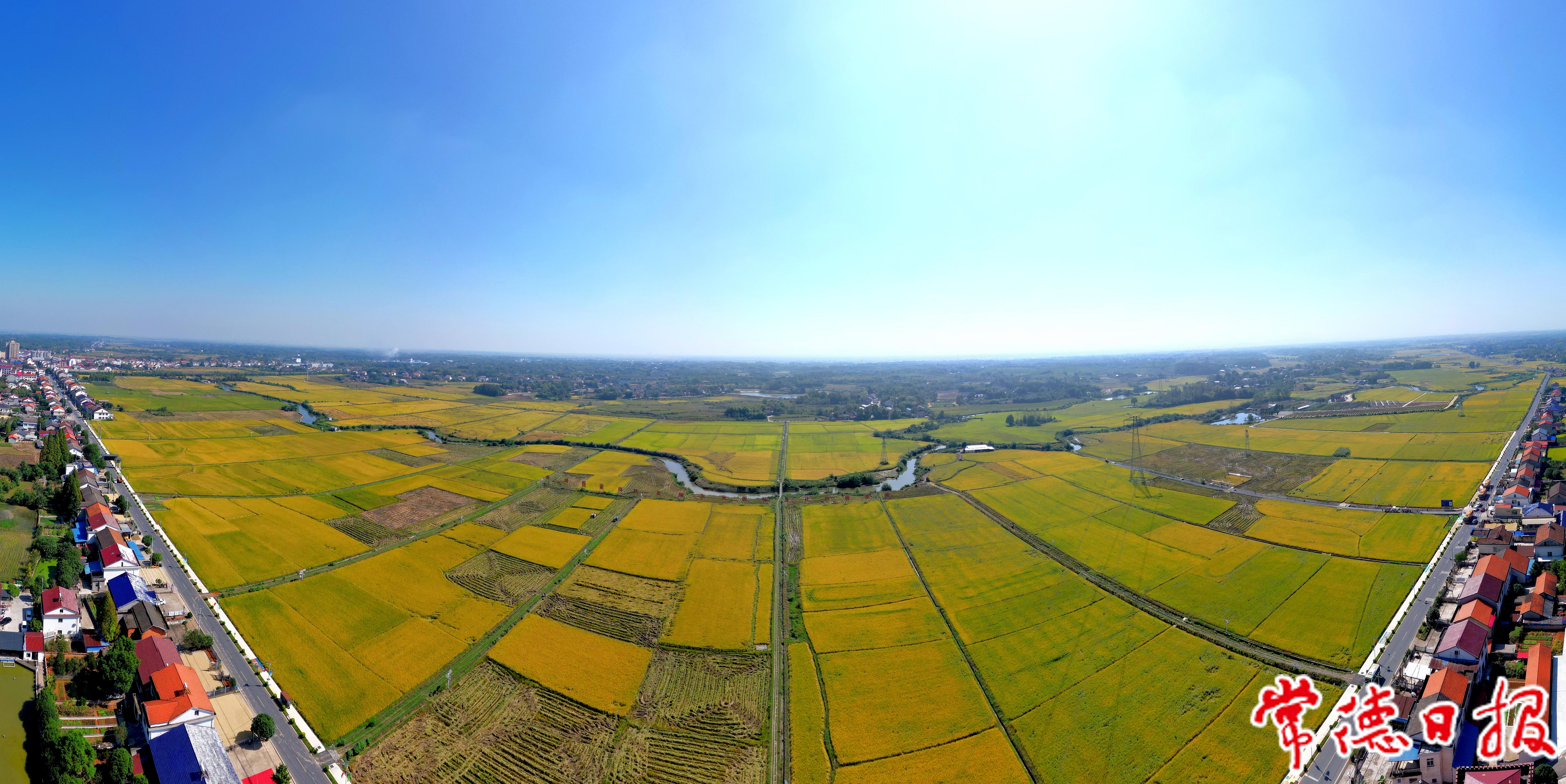 航拍鼎城區(qū)謝家鋪鎮(zhèn)糧食生產(chǎn)萬畝綜合示范片的晚稻染黃了大地,處處一派豐收的景象。王明睿 攝