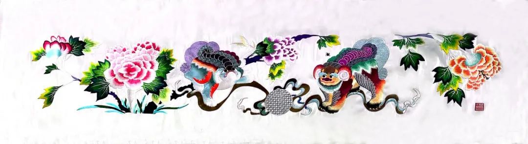 “雙獅戲球”是桃源刺繡特有的造型,這幅作品構(gòu)圖飽滿、刻畫細(xì)膩、刺繡針?lè)ǘ鄻?。在繡品中心位置從上至下懸掛著一只吐絲蜘蛛,諧音“喜從天降”,寓意吉祥,反映了桃源民眾對(duì)美好生活的熱愛(ài)。