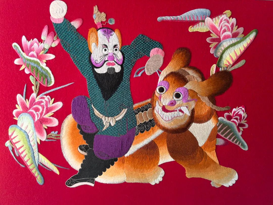 魏犨擒貘是流傳在楚地的傳統(tǒng)故事,也是桃源刺繡的典型素材?!拔籂咔荃钡募y樣體現(xiàn)了桃源百姓辟邪和護(hù)子的心理祈盼,具有忠勇、愛(ài)國(guó)的教化意義。桃源刺繡省級(jí)傳承人羅明華在這幅作品中采用了和色摻針、格紋針、蓋針、旋游針、盤線針、毛針等多種針?lè)?,人物表現(xiàn)得兇猛強(qiáng)悍,動(dòng)物似是而非,構(gòu)圖夸張,配色雅俗互鑒,針?lè)ê涟l(fā)畢現(xiàn),將桃源刺繡神秘、浪漫的氣質(zhì)表現(xiàn)得淋漓盡致。