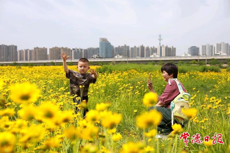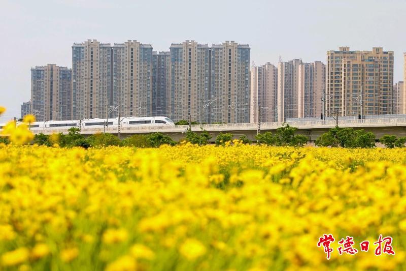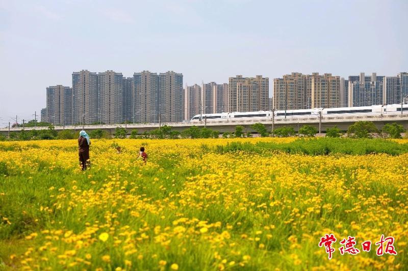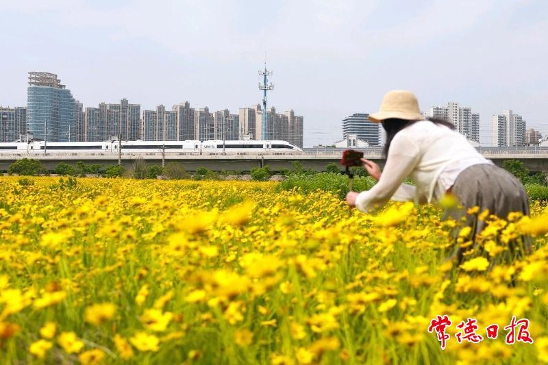 5月6日,在常德市城區(qū)太陽大道泰達潤景園小區(qū)對面,大片金雞菊燦爛綻放,金黃絢麗的景致美不勝收。呼嘯疾馳的高鐵,從這片“花?!遍g穿梭而過,引得眾多市民紛紛前來打卡,與高鐵同框。