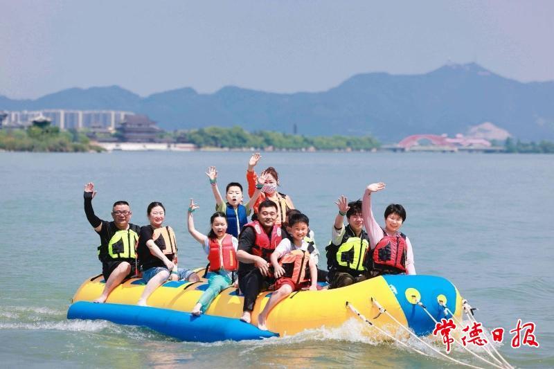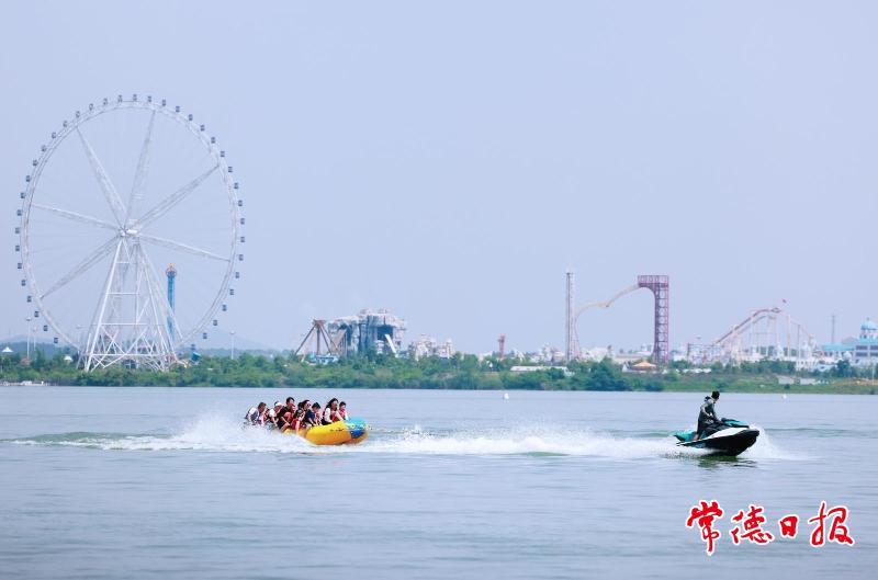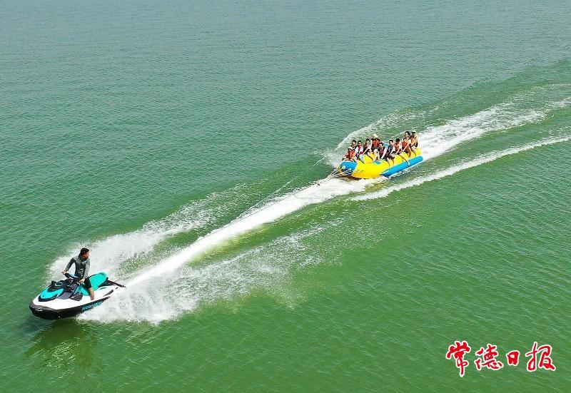 游客乘坐香蕉船在柳葉湖上感受沖浪帶來(lái)的樂(lè)趣