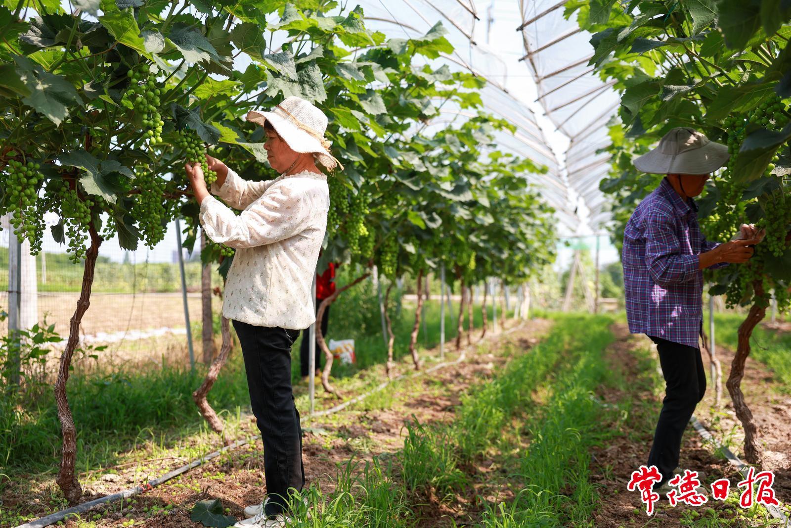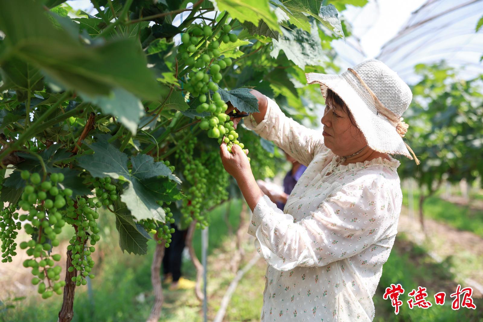 5月21日,在常德市兆康生態(tài)種養(yǎng)殖專業(yè)合作社的陽光玫瑰葡萄大棚,該合作社聘請了武陵區(qū)東江街道關(guān)天坪社區(qū)的居民,對葡萄串進行疏果、整枝,讓葡萄樹能夠集中養(yǎng)分。
