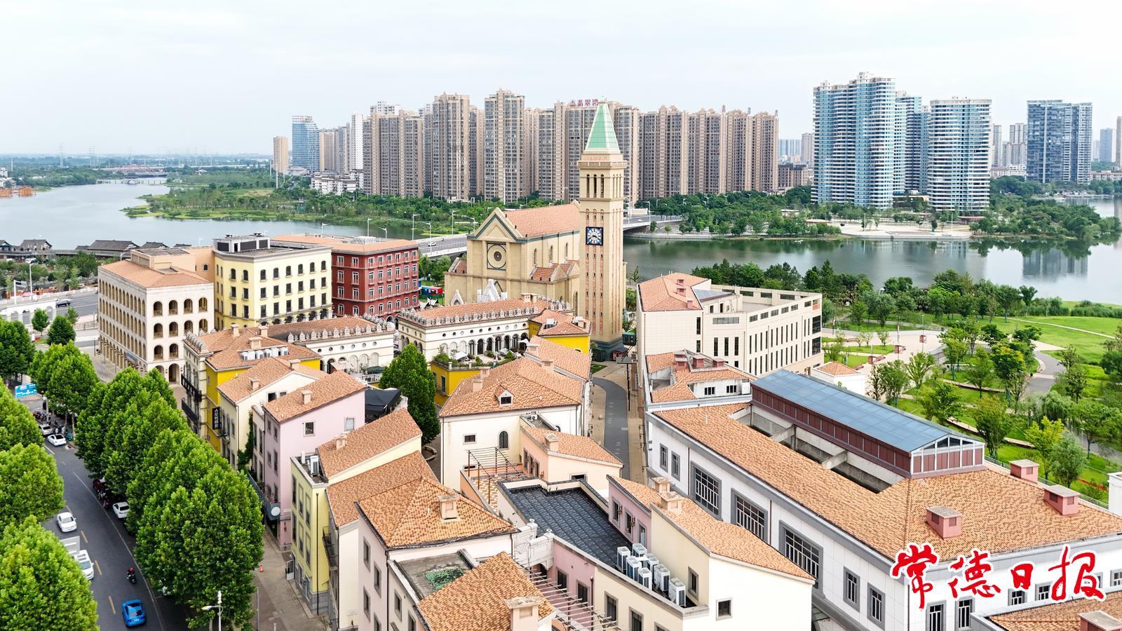 俯瞰常德河街西街,屋頂那一片片淡黃色塊,與淺綠、淺藍(lán)、深紅等色塊彼此交織,仿佛將童話世界映照于現(xiàn)實(shí)。(無人機(jī)航拍照片)