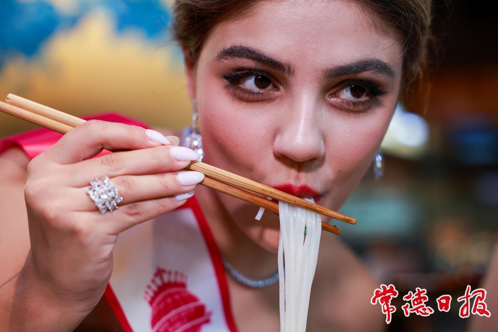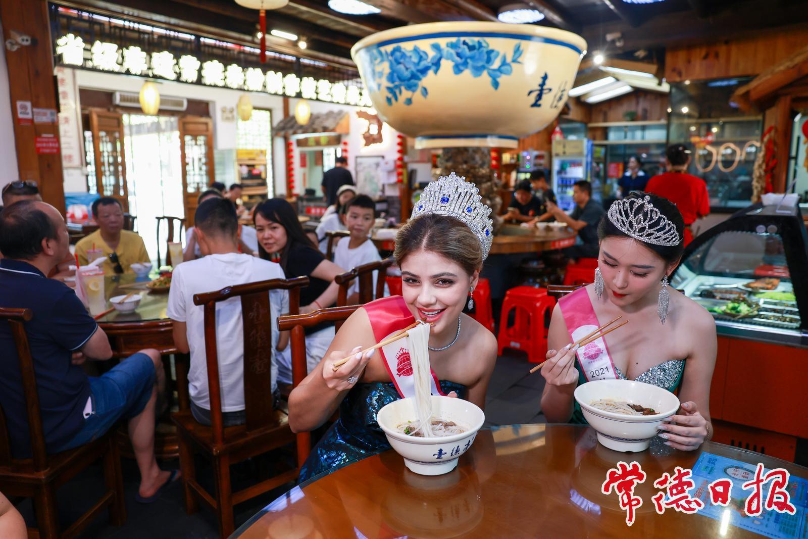 在常德河街壹德壹米粉店,2024世界旅游小姐全球總冠軍伊莎貝爾·奎羅斯·巴托利和2021世界旅游小姐中國區(qū)冠軍張涵鈺品嘗常德米粉