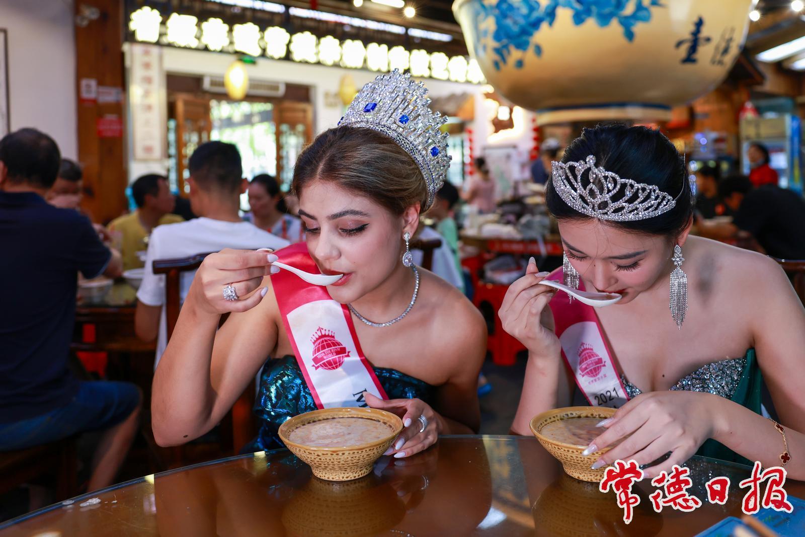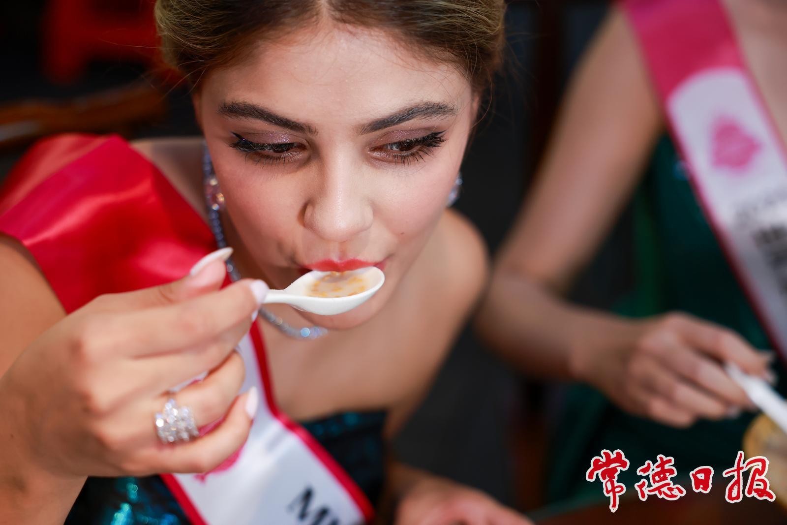 在常德河街德鼎記·老常德缽子菜,2024世界旅游小姐全球總冠軍伊莎貝爾·奎羅斯·巴托利和2021世界旅游小姐中國區(qū)冠軍張涵鈺品嘗常德缽子菜