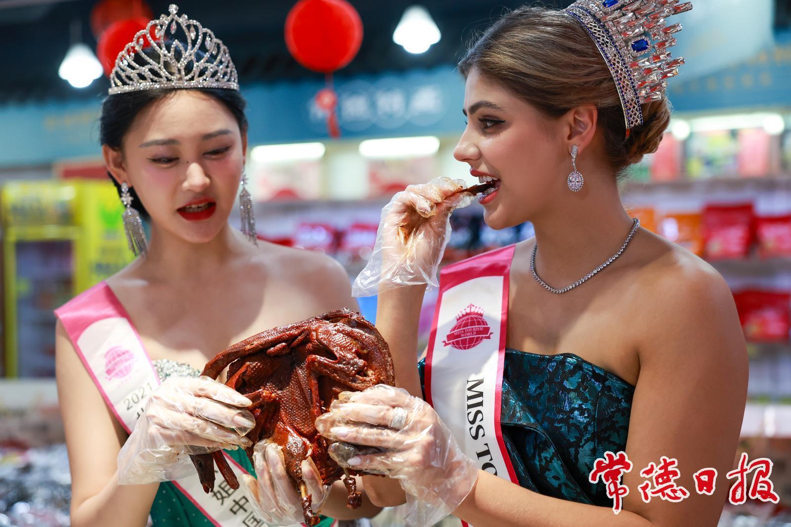在常德河街醬板鴨博物館,2024世界旅游小姐全球總冠軍伊莎貝爾·奎羅斯·巴托利和2021世界旅游小姐中國區(qū)冠軍張涵鈺品嘗常德醬板鴨