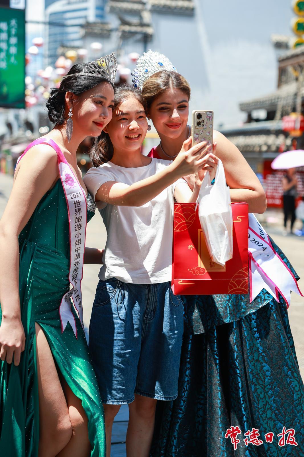 在常德河街,游客們爭相和2024世界旅游小姐全球總冠軍伊莎貝爾·奎羅斯·巴托利、2021世界旅游小姐中國區(qū)冠軍張涵鈺合影