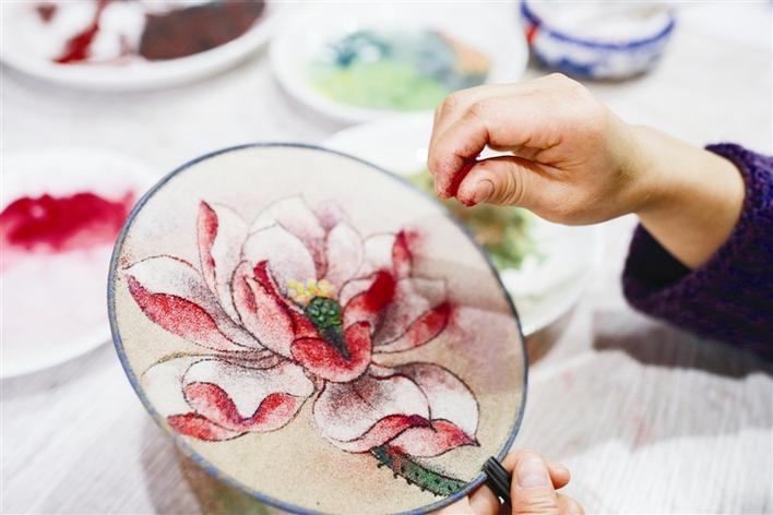 李健鷹用麻彩粉顏料給麻質(zhì)畫上色。