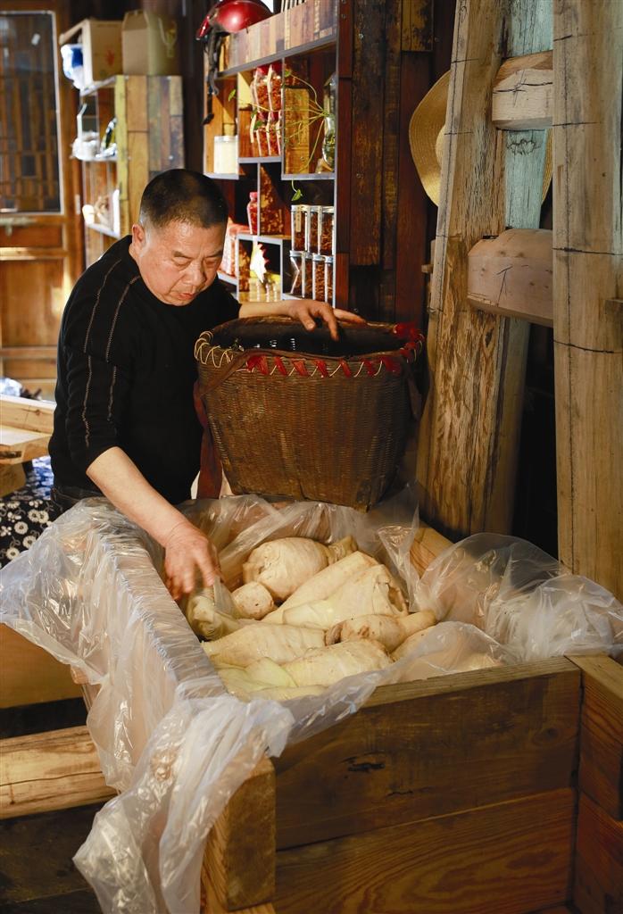 3月24日,常德河街,周正長用傳統(tǒng)手藝制作榨筍。