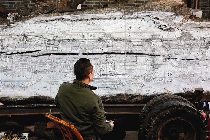 潘能輝在巨大的陰沉木前思索如何修改草圖。