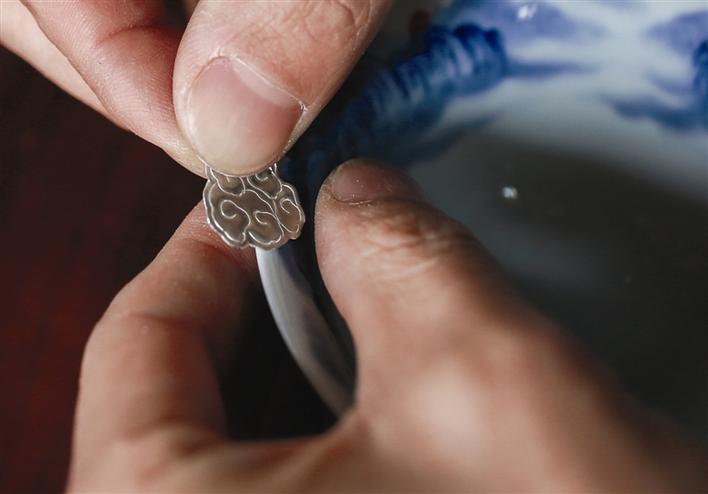 “90后”覃健,用銀片給瓷器補(bǔ)缺。