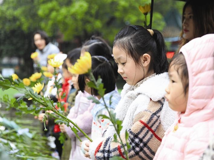 4月1日,金和嘉苑國(guó)際幼稚園的小朋友來(lái)到常德會(huì)戰(zhàn)抗日紀(jì)念碑,為烈士敬獻(xiàn)鮮花、花籃。羅蜀成 攝