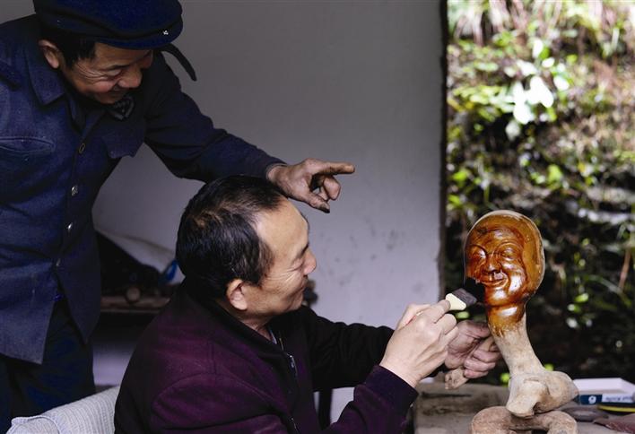 爬遍周邊山頭挖樹(shù)根,雨季在小溪撈木材。20年來(lái),邱青山創(chuàng)作出木雕作品100余件,或?qū)懸?,或?qū)憣?shí),有神話人物、各類(lèi)動(dòng)物以及日用品。