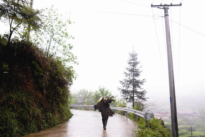 邱青山冒雨將小溪里淘到的木材背回家。