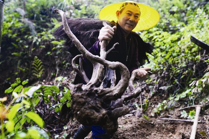挖到合適的樹(shù)根,邱青山的臉上洋溢著喜悅。