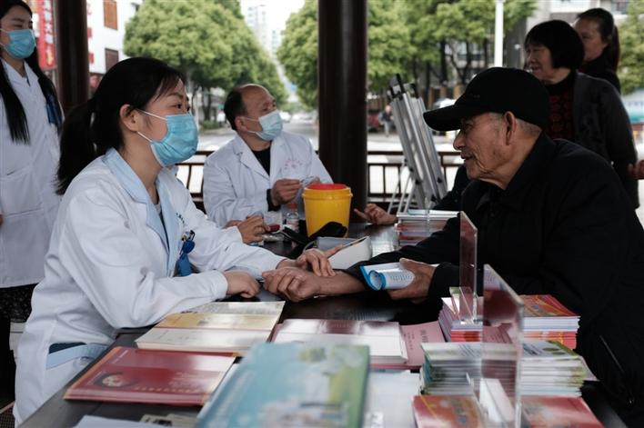 昨日,以“文明健康 綠色環(huán)?!睘橹黝},柳葉湖旅游度假區(qū)愛國衛(wèi)生運(yùn)動委員會在常德河街舉行了第33個愛國衛(wèi)生月宣傳活動。志愿者們?yōu)槭忻襁M(jìn)行義診,發(fā)放衛(wèi)健用品、滅“四害”物品等,并向群眾傳播健康理念,普及愛國衛(wèi)生相關(guān)知識。圖為街道衛(wèi)生服務(wù)中心醫(yī)護(hù)人員在為市民把脈。