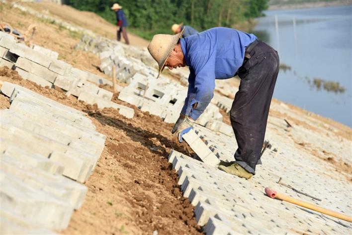 5月31日,澧縣澹水河澧澹街道澧東村堤段,施工人員在堤坡上鋪設(shè)工字型有孔水泥磚。近年來,該縣投資3000多萬元,對(duì)境內(nèi)主要河流易沖刷堤段進(jìn)行生態(tài)化護(hù)坡,有效提高了河堤防汛保安能力,利于草類植物生長(zhǎng)從而凈化水質(zhì)。