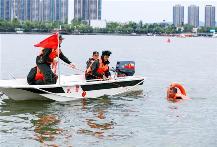 6月3日,武警常德支隊(duì)在柳葉湖開展水域救援集訓(xùn)暨抗洪搶險(xiǎn)實(shí)戰(zhàn)演練。圖為支隊(duì)?wèi)?zhàn)士救助“落水群眾”。