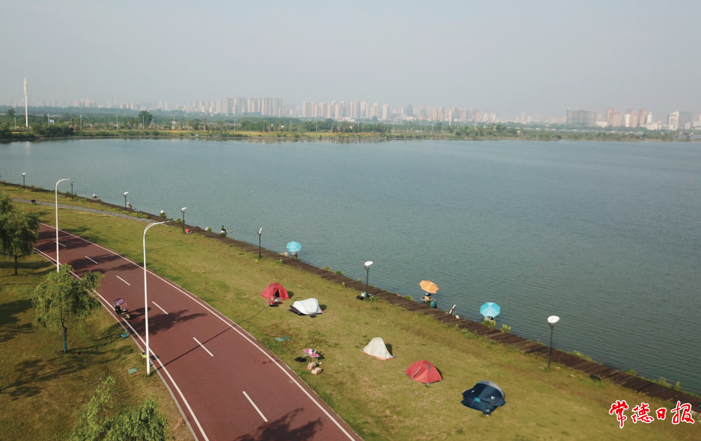 5月2日早晨,幾頂形態(tài)各異的帳篷點(diǎn)綴在湖畔。柳葉湖離城區(qū)很近,環(huán)境優(yōu)美,配套完善,是家庭露營的好去處。潘敬林 攝