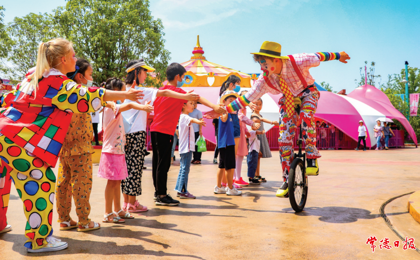 5月2日,柳葉湖卡樂星球,游客正在和小丑互動。胡世安 攝