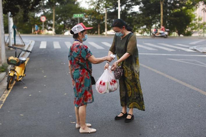 8月3日中午,武陵區(qū)丹陽街道紫橋社區(qū)丹陽路口,黨員志愿者在給出入社區(qū)的市民檢測體溫。 李龍攝