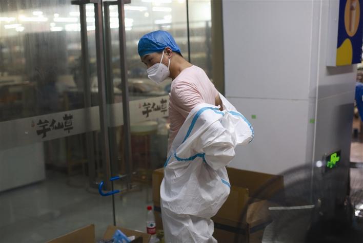 密閉的防護(hù)服內(nèi),志愿者大汗淋漓。徐珊珊 攝