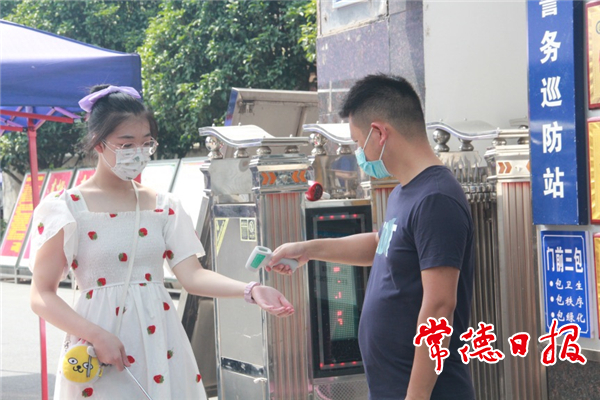 工作人員對(duì)學(xué)生檢測(cè)體溫