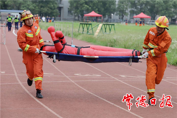 兩名指戰(zhàn)員用擔架抬著120斤重的假人進行模擬救援。市消防救援支隊供圖