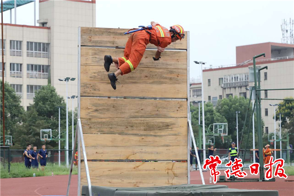 一名指戰(zhàn)員翻過3米高障礙。市消防救援支隊供圖