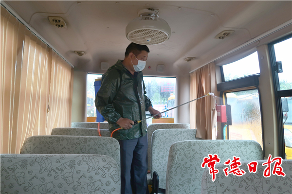 湘北校車公司工作人員對(duì)校車進(jìn)行消殺工作