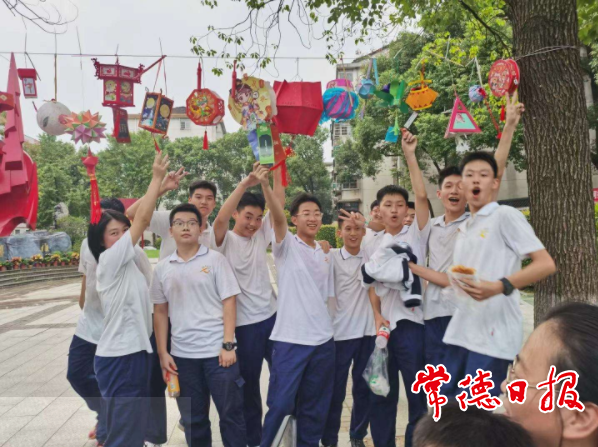 在常德市七中,學(xué)生們和花燈一起合影