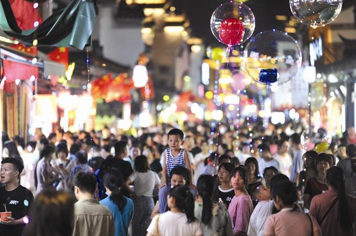 昨晚的常德河街國(guó)旗飄揚(yáng),人頭攢動(dòng),市民游客紛紛來(lái)此感受節(jié)日氣氛。
