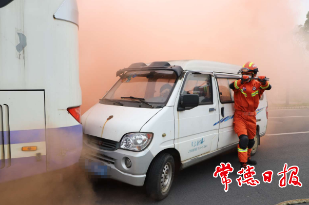 演練模擬一輛大型客車與一輛小型面包車在濱江大道南端追尾,面包車車頭冒煙,駕駛員“受傷”被困。鼎城區(qū)消防救援大隊(duì)在接到市消防救援支隊(duì)指揮中心出警指令后,立即啟動道路交通事故應(yīng)急救援預(yù)案,迅速聯(lián)動鼎城區(qū)公安局交警大隊(duì)、120急救中心等相關(guān)部門趕赴現(xiàn)場,展開聯(lián)合救援行動。
