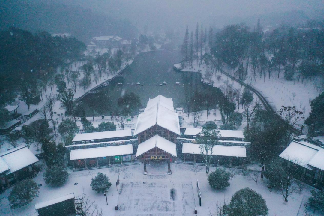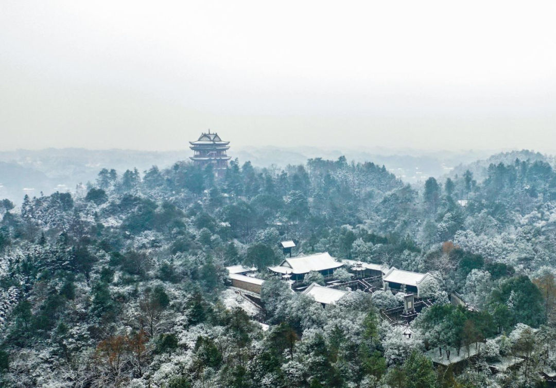 連綿的山巒和茂密的原始森林被潔白的雪花披上了一層銀裝,在樹梢上、古建筑屋頂上,千姿百態(tài)的冰花晶瑩剔透、美不勝收。從空中俯瞰,湖泊與雪景交相輝映,天地之間渾然一色,分外妖嬈。