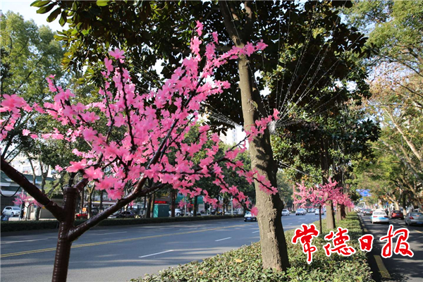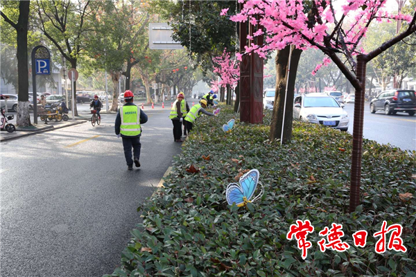 虎年春節(jié)將至,為打造文明整潔、管理有序、和諧平安的城市形象,營造歡樂喜慶、文明祥和的濃厚文化氛圍,市燈飾管理處正緊鑼密鼓地開展江北城區(qū)部分路段春節(jié)臨時亮化。昨日,記者到市城區(qū)武陵大道美景大廈段現(xiàn)場看到,6名工人正安裝插地式蝴蝶燈、調(diào)整桃樹燈、連接燈串,還有工人手拿工具檢查線路、調(diào)整滿天星燈帶、串聯(lián)電路。